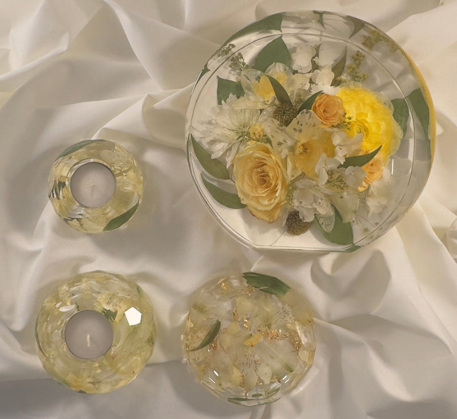 Each piece undergoes a refined preservation process, which includes meticulously drying your blooms, casting them in crystal-clear resin, and multiple finishing stages which create the perfect piece you can treasure for years to come. No two preservations are ever the same, and that’s what makes them special. It’s your story, your memory, suspended in time.